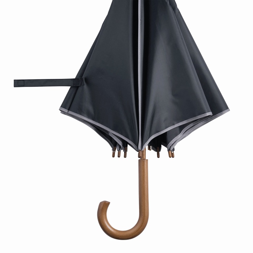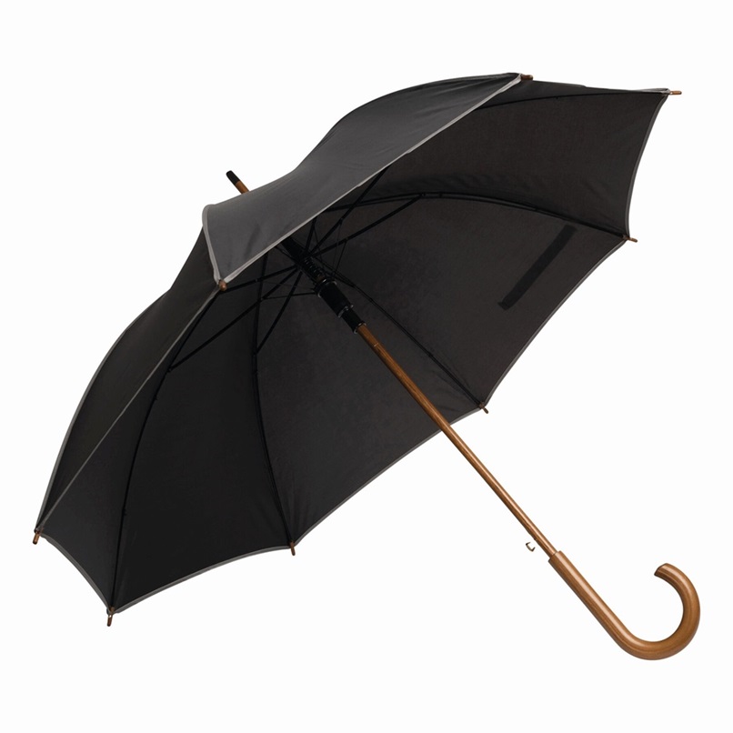 Automatyczny parasol WALTZ, poszycie poliester 190 T, kontrastująca lamówka, czarne metalowe szyny, laska i uchwyt z drewna w kolorze orzecha włoskiego. Rozmiar: Ø103 cm