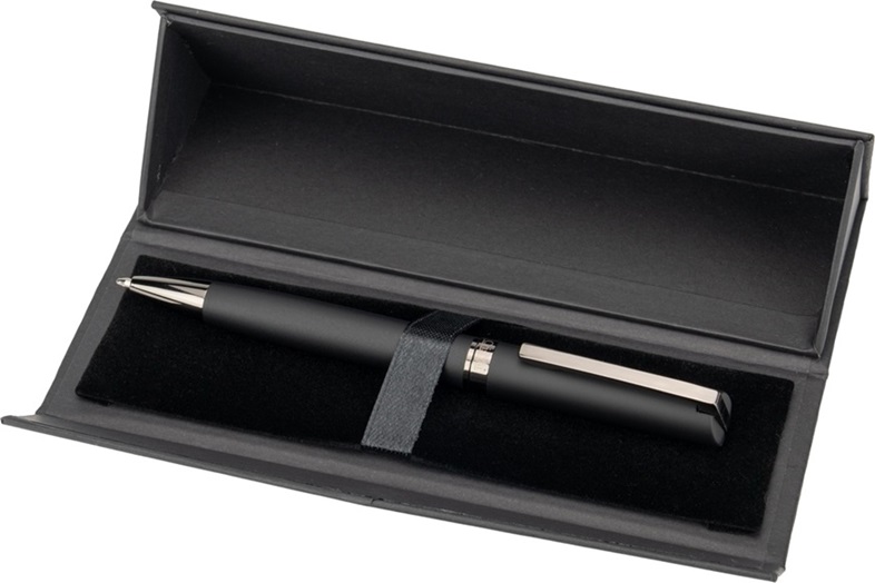 Przekręcany, metalowy długopis z gumową powierzchnią i niebieskim wkładem. Rozmiar: 14 x ⌀ 1,1 cm. Materiał: metal.