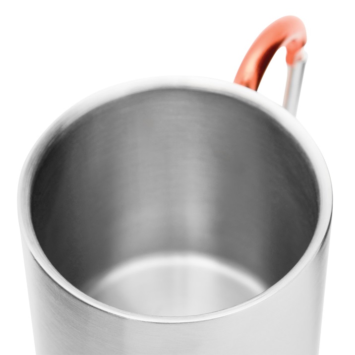 Kubek HIKING DAY ze stali nierdzewnej wewnątrz i na zewnątrz, pojemność ok. 200 ml, z kolorowym karabińczykiem. Rozmiar: Ø7 x 8 cm. Materiał: Stal nierdzewna / Aluminium.
