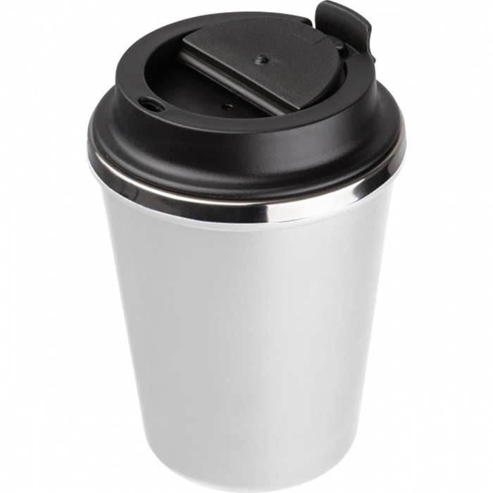 Kubek z podwójnymi ściankami ze stali nierdzewnej, z zewnątrz z plastikową powłoką z materiału pochodzącego z recyklingu, o pojemności 350 ml, z zamykanym ustnikiem. Rozmiar: 12,9 x ⌀ 9,2 cm. Materiał: stal nierdzewna.