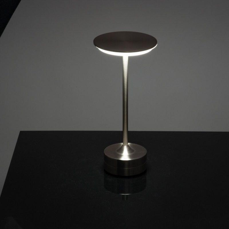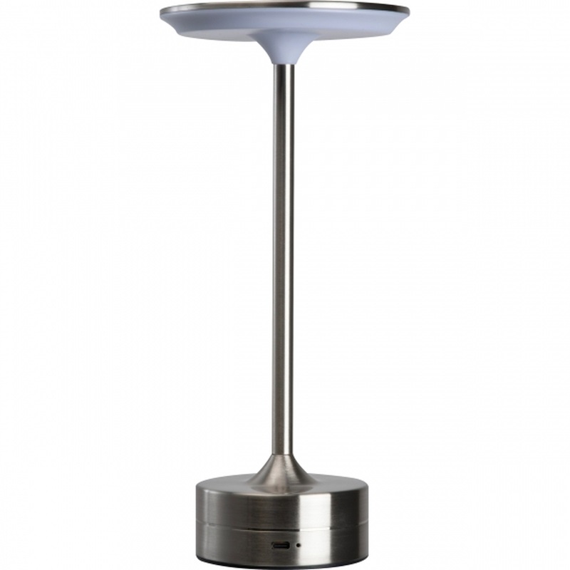 Lampka stołowa, wykonana ze stali nierdzewnej, z baterią o pojemności 800 mAh. Lampka posiada funkcję ściemniania i można ją przełączać między barwą światła zimną i ciepłą. Do lampki dołączony jest kabelek do ładowania typu C. Rozmiar: 28 x ⌀ 12,8 cm. Materiał: żelazo.
