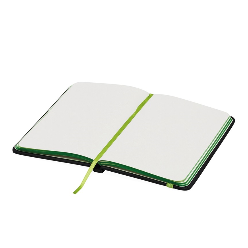 Notatnik LECTOR w rozmiarze DIN A6, z zaokrąglonymi rogami, kolorową taśmą do zamykania, kolorowymi marginesami i zakładką. Czysty, 80 stron, 70 g/m². Rozmiar: 14 x 9,1 x 1,3 cm