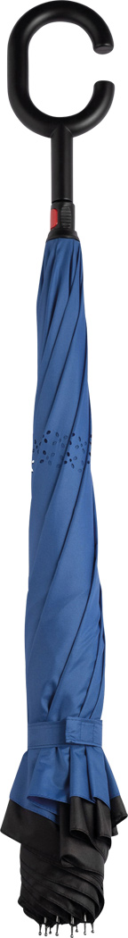 Parasol FLIPPED odwrotnie otwierany, z automatycznym mechanizmem zamykającym, z zabezpieczeniem, z uchwytem w kształcie C, dzięki któremu dłonie pozostają wolne, z podwójną, wentylowaną powłoką, metalową laską, szynami z włókna szklanego, metalowymi kolcami. Pokrycie z poliestru-pongee, zapinany na rzep. Rozmiar: Ø109 cm