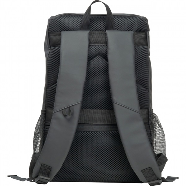 Duży plecak CrisMa, wykonany ze sztucznej skóry, w pojemnej kieszeni głównej, znajduje się specjalna przegródka na tablet. Plecak posiada dwie kieszenie boczne z siatki, kieszonkę antykradzieżową i watowane szelki. Rozmiar: 34 x 16 x 46 cm. Materiał: poliuretan (PU).