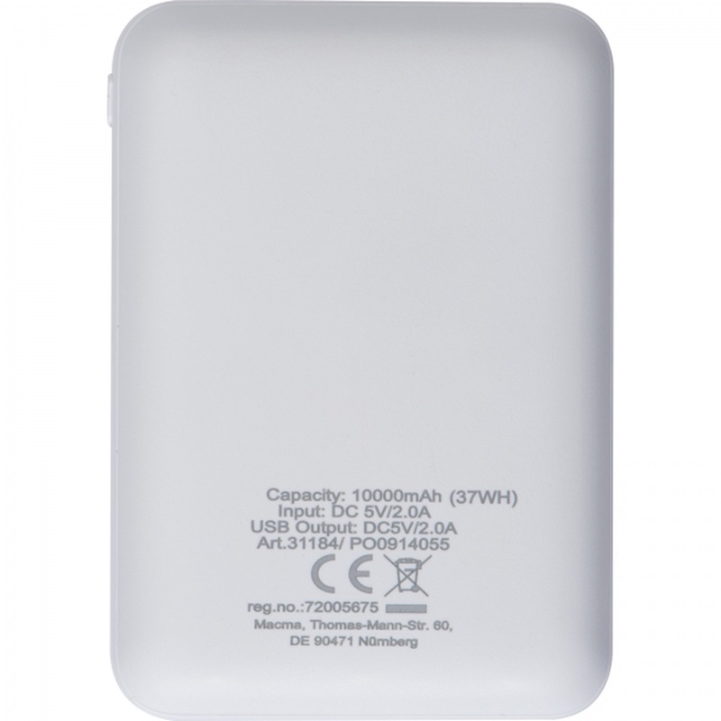 Plastikowy (ABS) power bank o pojemności 10000mAh. Wyposażony w kabel i wyświetlacz, a także 2 wejścia USB do jednoczesnego ładowania 2 urządzeń. Dane techniczne:Output: DC 5V 2000MA (max)Input: DC 5V 2000MA (max)Pojemność: 10000mAh (2 x 5000mAh),SafetyprotectionInne:Dołączony kabelek ze złączami USB A i mikro USB Rozmiar: 8,8 x 6 x 2,2 cm. Materiał: plastik