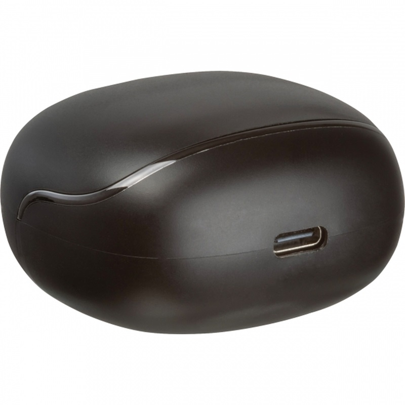 Słuchawki bezprzewodowe (40 mAh) z etui ładującym (500 mAh). Czas grania naładowanych słuchawek wynosi 6h.Rozmiar: 5,2 x 4,8 x 3 cm. Materiał: silikon.