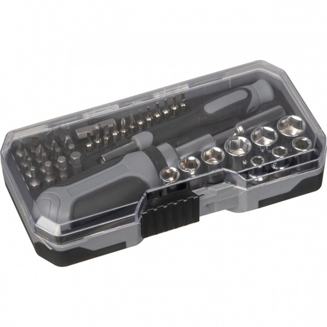 Zestaw 41 bitów i nakrętek oraz dwa uchwyty, całość w poręcznym pudełku. Rozmiar: 17,8 x 9,6 x 3,4 cm. Materiał: stal nierdzewna.