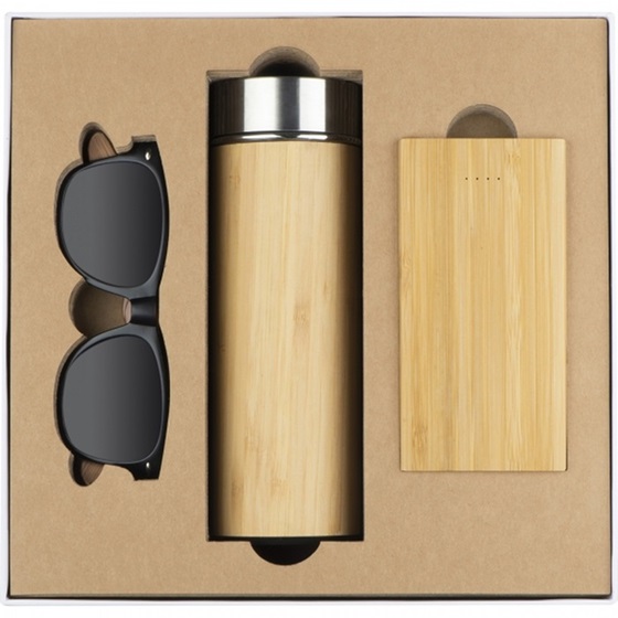 Przyjazny środowisku zestaw bambusowy, w skład którego wchodzi butelka ze stali nierdzewnej z zaparzaczem, okulary przeciwsłoneczne oraz power bank o pojemności 8000 mAh. Dane techniczne powerbanka:Input: DC5V 2A (Max. )Output: DC5V 2APojemność: 8000 mAhInput: Type C, micro USBOutput: USB A x2Inne:Do powerbanka dołączony kabelek ze złączami USB A i mikro USB Rozmiar: 25,5 x 26,2 x 7,5 cm. Materiał: stal nierdzewna