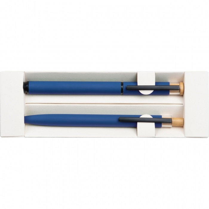 Zestaw piśmienny składający się z piszącego na niebiesko długopisu i pióra kulkowego, wykonany z aluminium z recyklingu. Całość zapakowana w pudełko. Rozmiar: 17,8 x 5,8 x 2,2 cm. Materiał: PET.