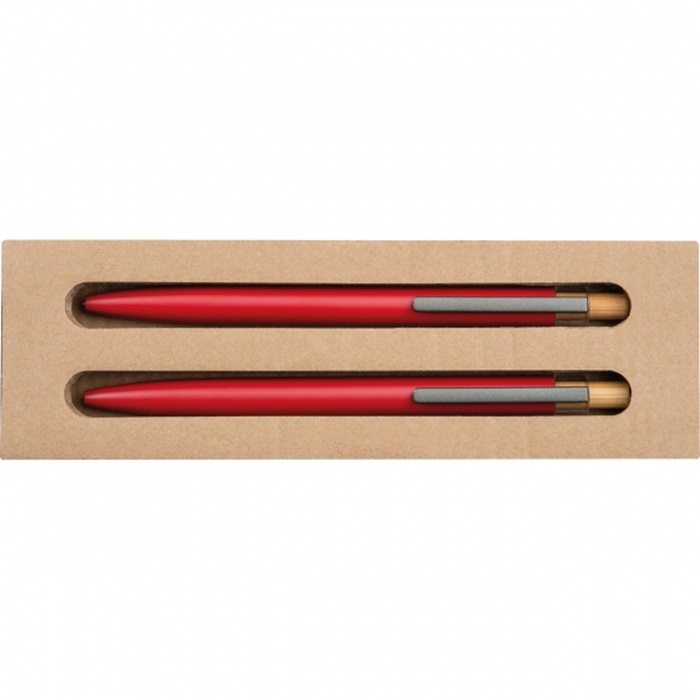 Zestaw piśmienny składający się z długopisu półżelowego, piszącego na niebiesko i ołówka automatycznego. Przybory piśmienne wykonane z aluminium pochodzącego z recyklingu, zapakowane w przyjazne środowisku pudełko. Rozmiar: 17,7 x 5,8 x 2,1 cm. Materiał: metal.