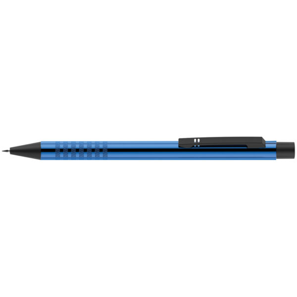 Metalowy długopis z niebieskim wkładem,ze zdobieniem na korpusie Rozmiar: 15 x ø 0,9 cm